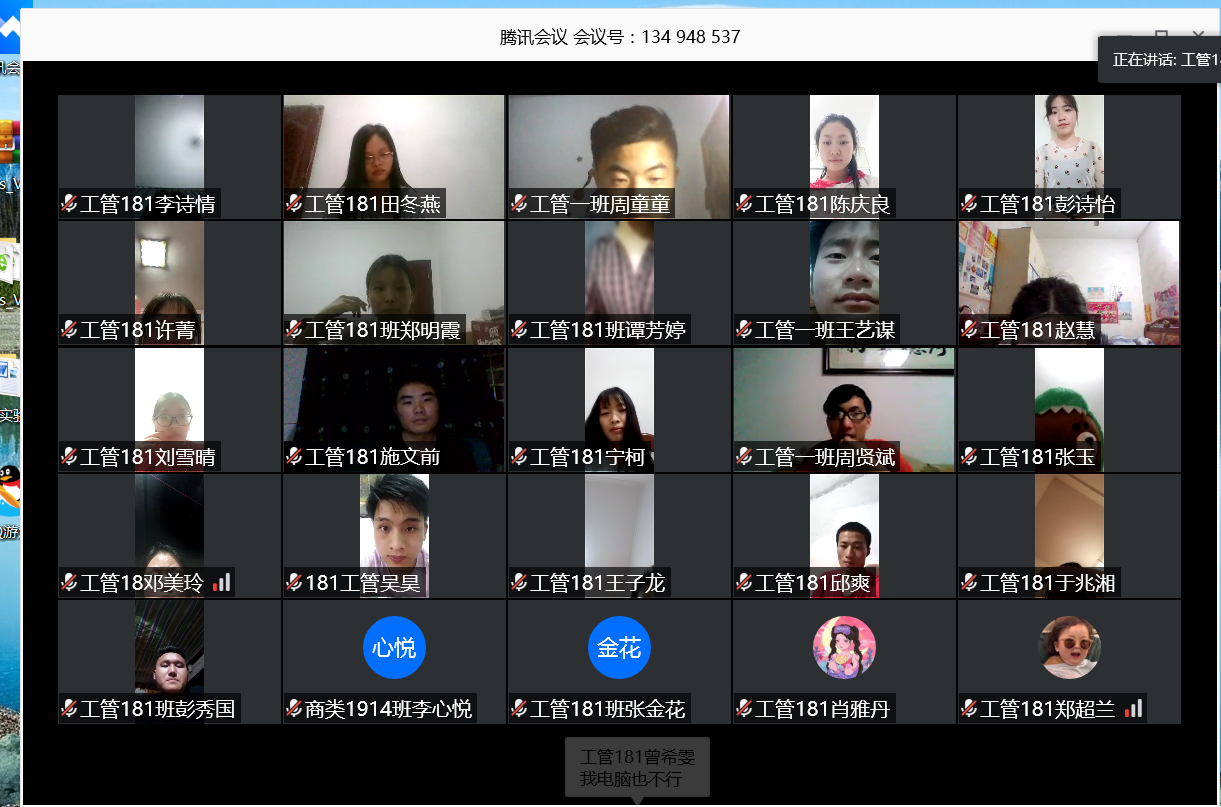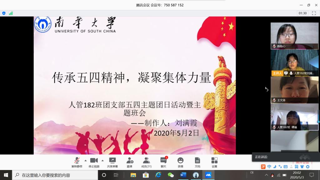 人管182班团支部以 “传承五四精神,凝聚集体力量”为主题开展线上讨论交流,员工刘满霞主持了此次活动。首先,员工们围绕“听到过最热血沸腾的一句话”、“我所理解的五四精神”以及“南华青年是怎样以实际行动抗击疫情”三个问题进行讨论。员工们踊跃发言,积极讲述着自己的思想与感悟。接着,大家共同观看了微团课视频。随后,员工们依次分享了一些抗疫小故事以及受到集体帮助的经历。故事虽小,却也令人动容,无不体现着新时代青年的奋发有为、团结向上。最后,经管法公司党委书记、人管182班班主任王文涛表示,同学们的讨论和发言都体现出了深邃的思想以及到位的实践,她感到很欣慰,通过这一次主题团日活动,一起回顾了五四青年节的来龙去脉,意义十分重大。她希望同学们一能找到自己的初心,坚定理想信念,二能练就过硬的本领,为社会做出更大的贡献。三要独立自主,自力更生,成为坚强的一代。