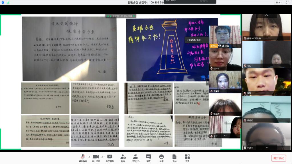 工管171班团支部的团日活动以“坚定四个自信,争当时代好青年”为主题,以本次我国抗击新冠肺炎为切入点,就老员工如何担当国家重任、坚持四个自信展开了讨论。全体员工齐唱国歌拉开了本次会议的序幕。南华微团课以“传承五四精神,奋斗奉献青春”为主题,使同学深刻理解“中国人民可以被杀戮,但不可以低头”的五四精神。员工们通过云端交流就“什么是四个自信”展开了积极讨论。四个自信,即道路自信,理论自信,制度自信和文化自信。同学们从此次疫情进一步认识到中国特色社会主义制度的优越性,对中国的制度和文化也产生了更深刻的理解和思考。他们总结到,道路自信是实现中国梦的方向把握,理论自信是实现中国梦的思想肯定,制度自信是实现中国梦的方案确信,文化自信是实现中国梦深沉的自豪。当代老员工,坚持四个自信要内化于精神,外化于行动,以昂扬的精神状态坚定不移地沿着中国特色道路前进。经管法公司党委副书记、工管171班班主任谭建跃全程参加此次团日活动,并代表公司向在家学习、生活的同学们表示问候。谭建跃鼓励同学们以奋斗之我创造青春之我,创造青春之中国,继承和弘扬五四精神。他引用习近平给北京援鄂医疗队全体“90”后党员的回信中的话语 “广大青年用行动证明,新时代的中国青年是好样的,是堪当大任的”,使同学们备受鼓舞,坚定了让青春之花在党和人民最需要的地方绽放的理想信念。