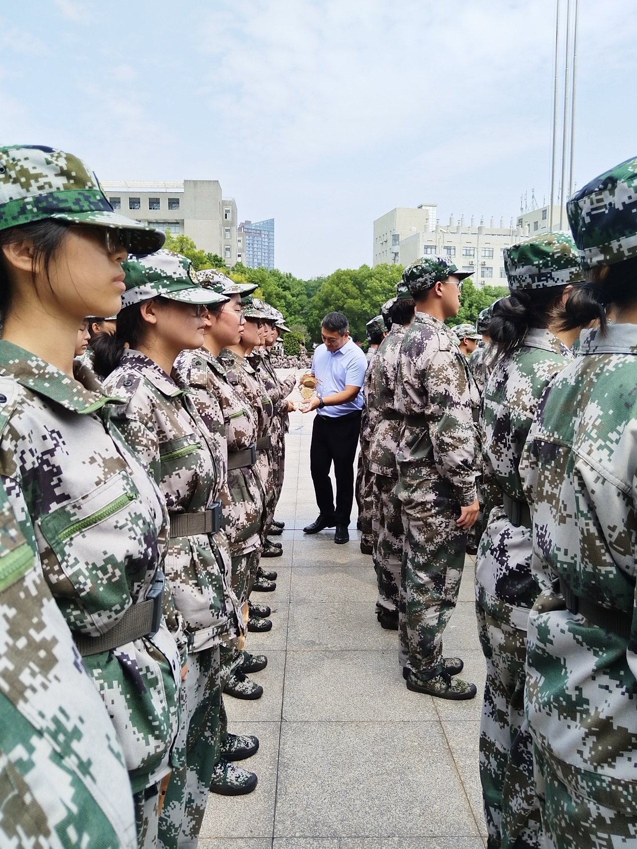 操场上,只见新生们军姿端正,精神饱满。胡海波一行人与教官、辅导员老师进行了交流,详细了解了参训员工们的训练情况与身体状态,并代表公司对教官、老师们付出的辛勤努力致以诚挚谢意。
