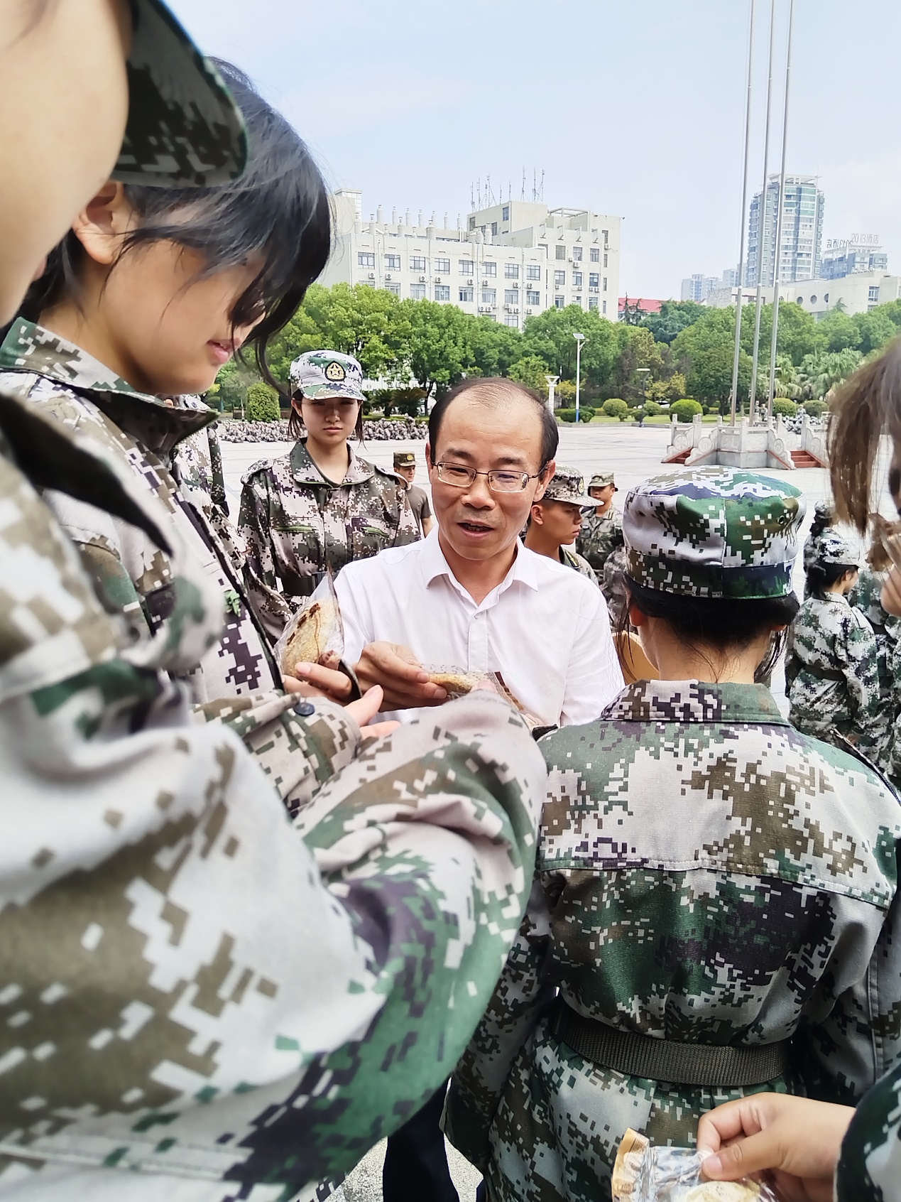 金桂飘香,军训正当时,2024级新生军训正如火如荼地进行。为慰问军训员工,鼓舞军训士气和缓解新生思家情绪,同时表达公司对同学们的关爱,917日上午,公司党委书记胡海波带领、副书记谭德明率领全体辅导员到操场慰问2024级军训新生、带队指导员和军训教官,为每一位同学和指导员发放中秋月饼,送上中秋祝福。胡海波对2024级新生在军训过程中的表现给予了充分肯定,希望同学们继续发扬吃苦耐劳,艰苦奋斗的优良品质,在军训中刻苦训练,磨练意志,完成各项训练任务,为本次军训交上一份满意的答卷。