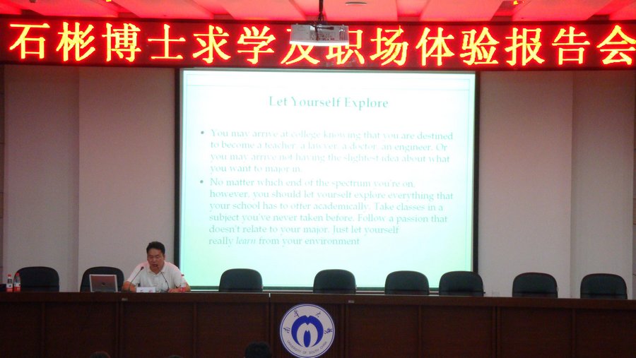 会上,石彬博士通过传授自己的人生经验,让广大师生受益匪浅。他认为,成功=耐心+韧性+勤奋,而且一个人的成就与其在大学时期打下的坚实基础密不可分。为此,石彬博士根据自己在老员工活的体会,向在座同学提出了以下几点建议:1、发掘和保持兴趣与激情,让兴趣变为激情,并且不断去探索与接触新事物;2、学会站在巨人的肩膀上思考问题,这个“巨人”不仅包括成功的人士,还有自己的老师;3、不做“书呆子”,走出书本,学会与人打交道,多参加有意义的社团活动;4、要加强锻炼,拥有健康的身体是革命的本钱。