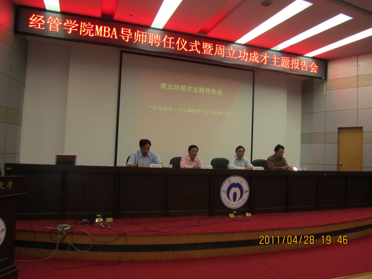 4月28日,公司MBA导师聘任仪式暨周立功成才主题报告会在图书馆报告厅。公司党委书记邹树梁,广州周立功单片机发展有限公司董事长、广州致远有限公司总经理周立功先生出席仪式。公司党委书记陈炳炎、副经理刘萌芽、聂绍芳、党委副书记廖迎春参加仪式。仪式暨报告会由经理周晓东主持。