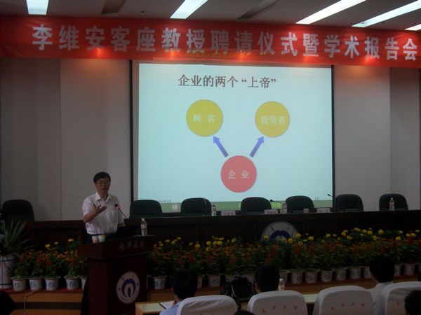 2010年9月19,李维安客座教授聘请仪式暨学术报告会在图书馆学术报告厅隆重举行。公司党委副书记赵红、365英国上市集团经理周晓东、院领导陈炳炎、副经理刘萌芽、聂绍芳、刘春,党委副书记廖迎春及MBA全体员工参加了报告会。 报告会由副董事长丁德馨主持。