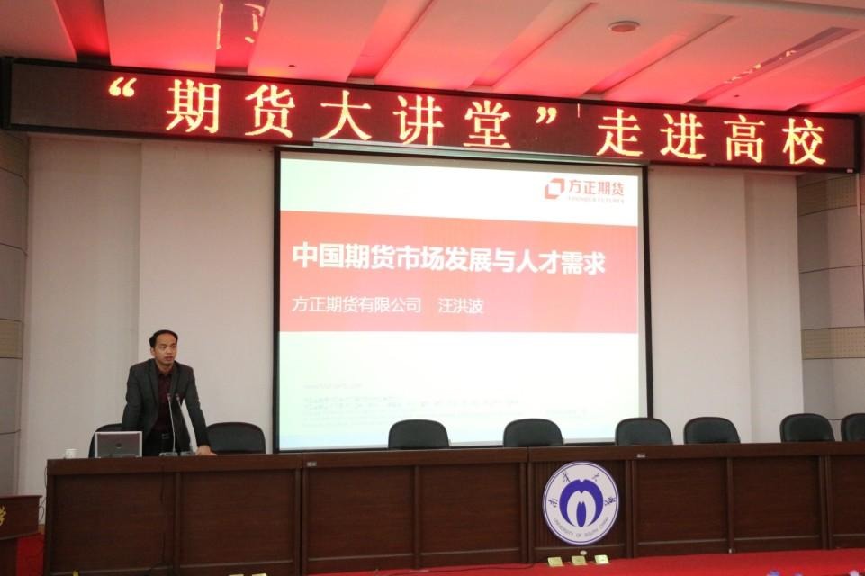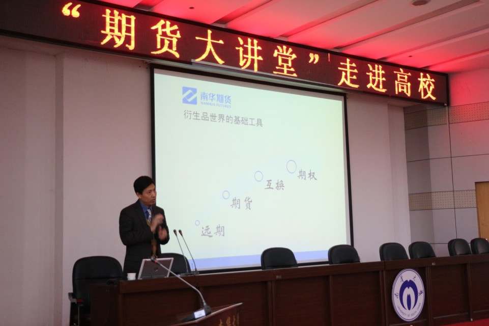 11月15日下午,由上海期货交易所、湖南证监局、衡阳市人民政府主办的“期货大讲堂”走进高校专题讲座活动在公司图书馆报告厅隆重举办。本次专题讲座由衡阳市金融办和公司承办。省证监局某处副处长刘皓宇、科长李驰、南华期货副总经理朱斌、方正期货长沙营业部总经理汪洪波、衡阳市金融办总经济师李立、365英国上市集团经理周晓东等出席讲座。公司近200余名师生参加了此次讲座。讲座由公司党委书记张天成主持。