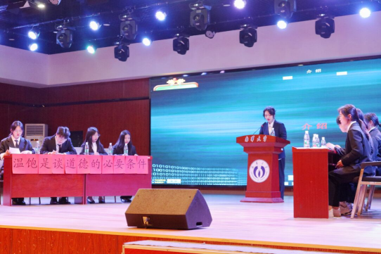 双方就“温饱是否是道德的必要条件”这一辩题展开激烈辩论。正方辩手开篇立论、概念先行,旗帜鲜明地提出“温饱是讲道德的前提”这一立场;反方辩手亦不甘示弱,他们博古论今,引典据理,结合真人真事,毫不含糊,态度分明地反驳对方论点。质询阶段将现场气氛推向高潮。各执一词,质疑问难,双方辩手夺席谈经,逻辑清晰,态度犀利地质询对方辩手,赢得场下观众赞叹不绝。而驳论环节更为精彩,双方唇枪舌剑,攻守有力。反方通过“有关道德的人类学”、“奴隶社会和封建社会道德学说”、“孔子道德体系”和杜甫“床头屋漏无干处仍有大辟天下寒士俱欢颜”济世情怀等例子,摆事实讲道理。正方面对质询则不卑不亢,逐一反论,坚守己方观点。在正反方你来我往中,这场没有硝烟的鹅湖之会落下帷幕,反方法学222班最终获得胜利。