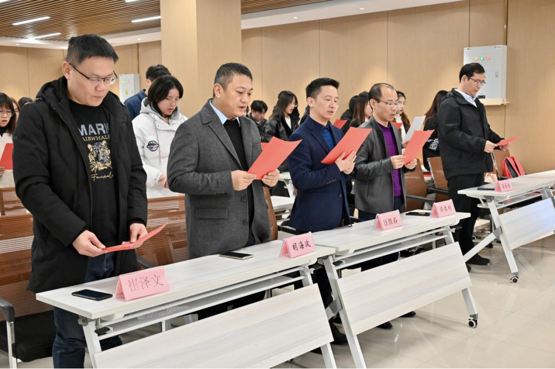第二届英国365上市公司法律协会换届表彰大会中,谭德明宣读表彰名单,会议对孙执豪等优秀干部颁发荣誉证书,随之宣布下一任聘任干部名单,邓湘等人接过聘书,师生合影留念。