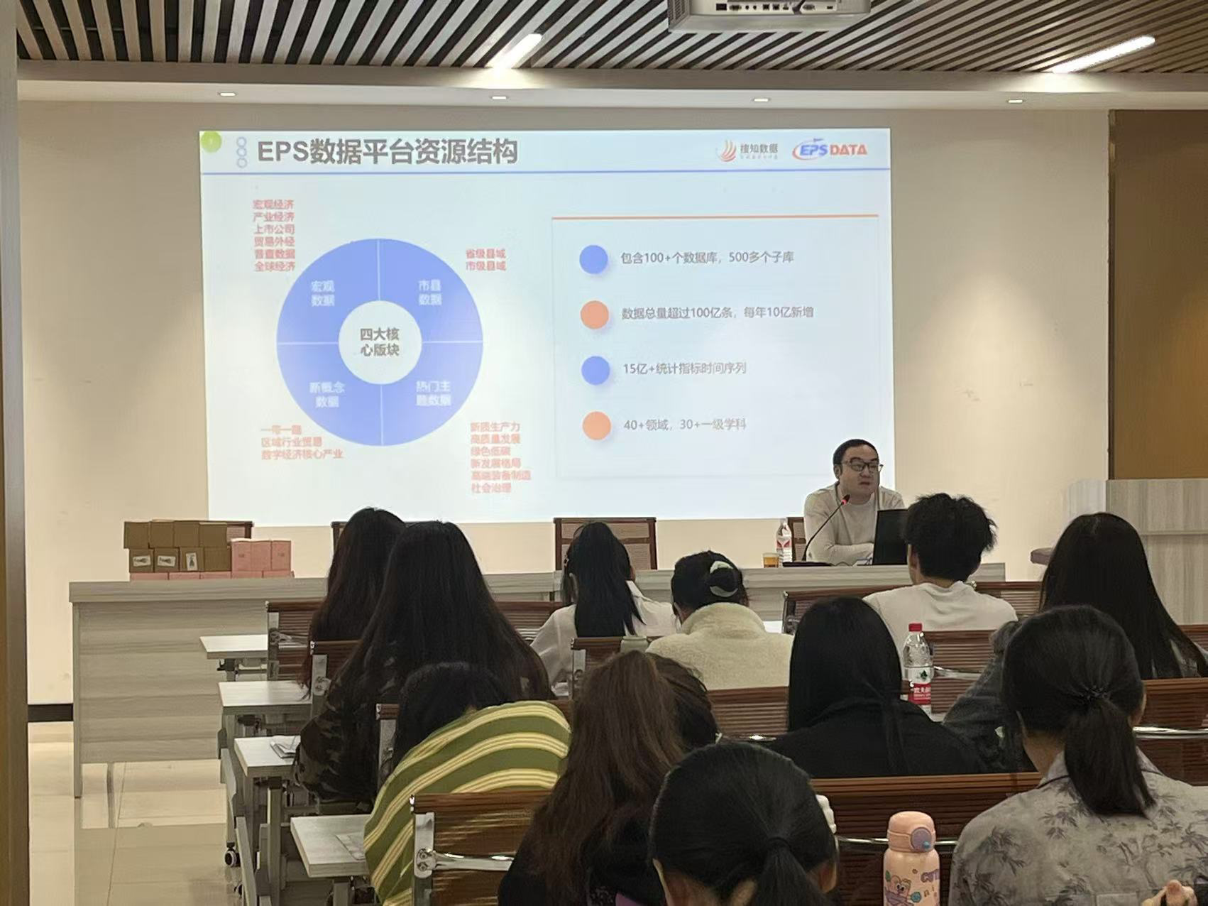 本次讲座由EPS数据资深培训师、“搜知杯”全国信息素养大赛指导老师周进主讲。周进老师首先详细介绍了EPS数据平台的使用方法。他通过实际操作演示,向同学们展示了如何高效利用EPS数据平台进行数据检索、下载和分析,强调了平台在科研工作中的重要作用。周老师指出,掌握数据平台的使用技巧,对于提高科研效率和质量具有重要意义。
