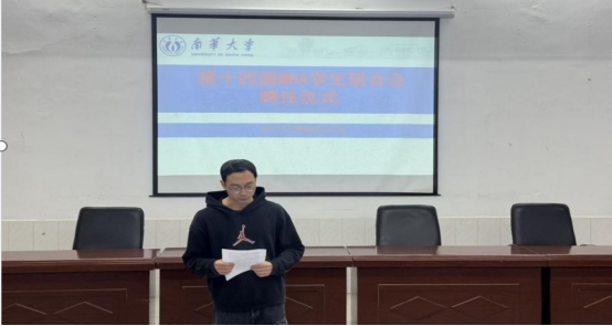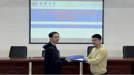 仪式迎来了庄严的会旗交接环节。在上一届MBA员工联合会代表谭鹏与全体与会人员的共同见证下,联合会会旗郑重交接到新一届会长王强手中。旗帜的传递,是责任的接续,更是南华MBA学子薪火相传、奋勇争先精神的传承,现场再次响起热烈掌声,将仪式氛围推向高潮。