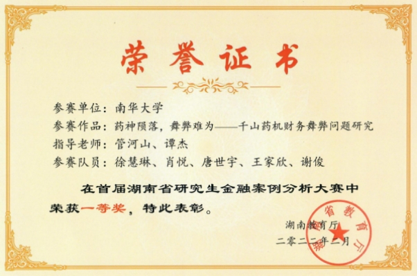 图3 获得湖南省首届研究生金融案例大赛获一等奖1项