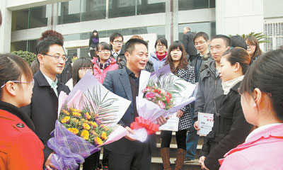 会后,邱醒亚先生(中捧鲜花者)与公司员工交流