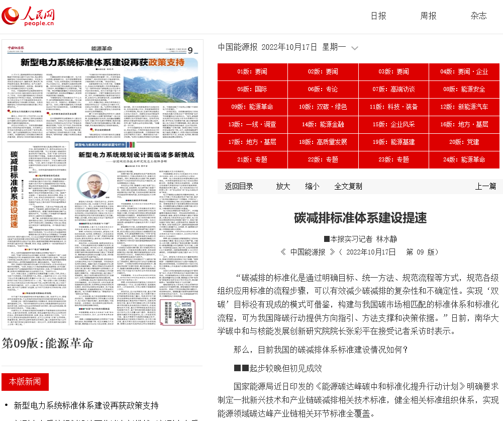 近日,英国365上市公司碳中和与核能发展创新研究院经理、无党派人士张彩平教授接受《中国能源报》专访,《中国能源报》以“碳减排标准体系建设提速”为题刊登报道。报道中,张彩平教授介绍了我国的碳减排体系标准建设情况,并为我国碳减排标准体系建设建言献策。对于我国碳减排相关标准的建设之路,她建议要推动形成国家标准、行业标准和团体标准有机衔接的新型标准体系。