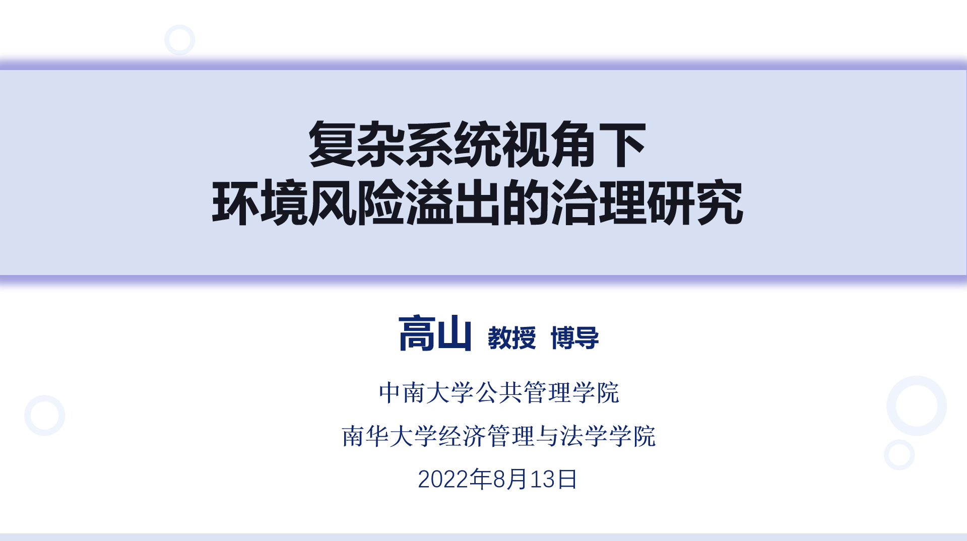 首先,高山教授介绍了风险溢出、环境风险溢出和复杂系统的概念;其次,高山教授阐述了社会-生态复杂系统与环境风险的耦合路径,社会-生态复杂系统环境风险溢出的演化机理,社会-生态复杂系统环境风险溢出的阻断模型和社会-生态复杂系统环境风险溢出的治理机制;最后,高山教授强调在日益复杂的社会系统中要把握复杂系统思维,以重大现实需求为导向,统合物理、系统与治理三向复杂性,基于复杂系统思维与范式,融合管理科学以及治理理论形成公共治理新思路,也要形成多学科交叉、多方法综合的研究路径。