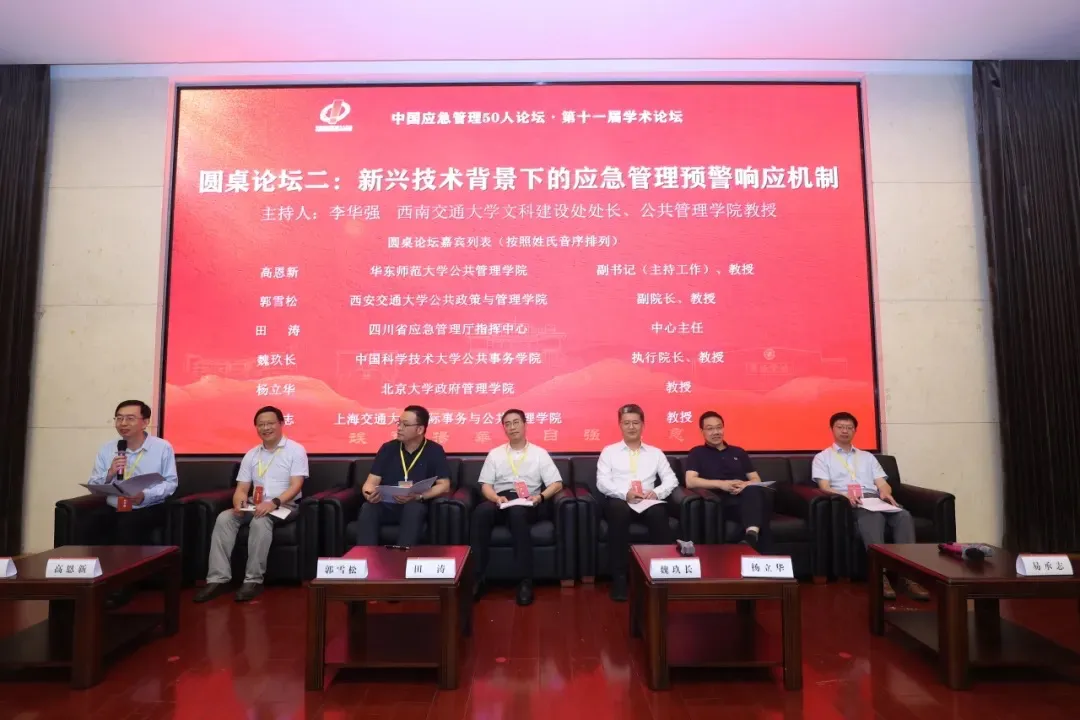 圆桌论坛分别由清华大学公共管理公司党委书记彭宗超和西南交通大学文科建设处处长李华强主持,来自北京大学、复旦大学、上海交通大学、南京大学、中国科学技术大学、西安交通大学、武汉大学、中国人民大学等高校的学者,以及四川省应急管理厅、成都市应急管理局、雅安市应急管理局等相关领域的实践专家围绕“AI 赋能基层应急能力提升”、“新兴技术背景下的应急管理预警响应机制”等主题,展开了系统深入的研讨交流。